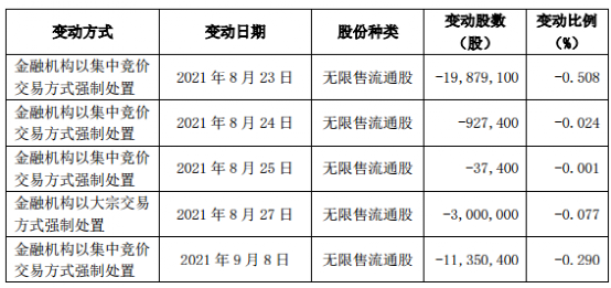 具体来看,相关金融机构于2021年8月23 日至2021年9月8日以集中竞价交易方式和大宗交易方式强制处置华夏控股持有的35194300股公司股份,占公司当前总股本的0.90%。