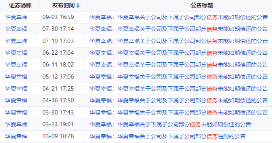终于在2021年2月1日,华夏幸福首次公告暴雷,称截至公告日公司及下属子公司发生债务逾期涉及的本息金额为52.55亿元,涉及银行贷款、信托贷款等债务形式。随后华夏幸福债务逾期公告密集出现,几乎是每两周一次,至9月3日累计发出13份债务违约公告,最新逾期未还债务879亿元。
