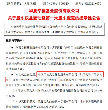 9月9日晚,深陷债务泥淖的华夏幸福发布公告,因控股股东华夏控股持有的公司股票被强制执行,导致持股比例下降,原第二大股东平安人寿及其一致行动人被动成为公司第一大股东。